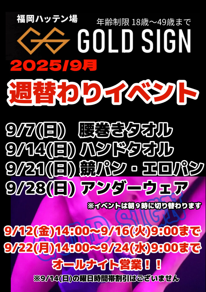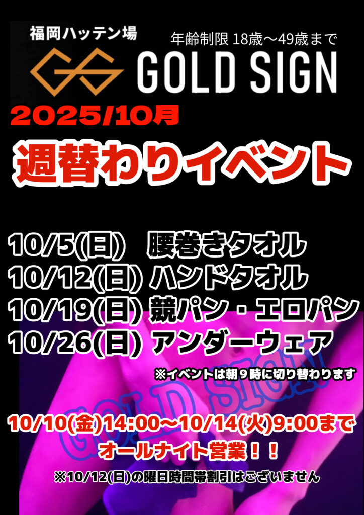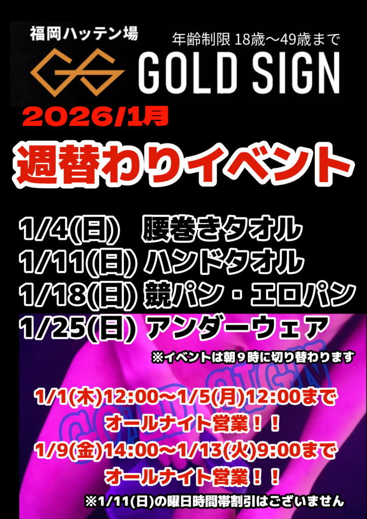 ①毎週木曜 22時~24時の入場 ¥1,300 ②毎週日曜 20時~22時の入場 ¥1,300 ※祝前日は適用外となります。 ※46歳〜49歳の方は、曜日時間帯割引対象外となります。 |
